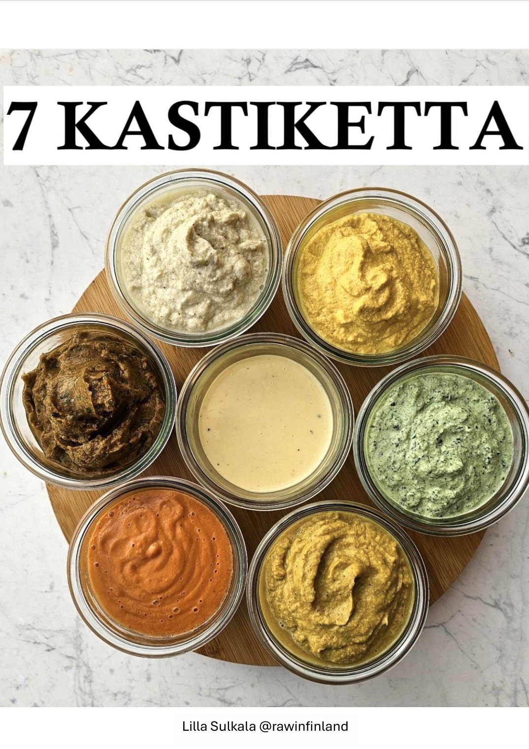 7 Kastiketta e-kirja sisältää seitsemän suosikkireseptiä arjen kastikkeiksi. Reseptit on kehittänyt raakaruokavalmentaja Lilla Sulkala (@rawinfinland). Kaikki reseptit ovat gluteenittomia, sokerittomia, öljyttömiä, suolattomia ja raakavegaanisia.